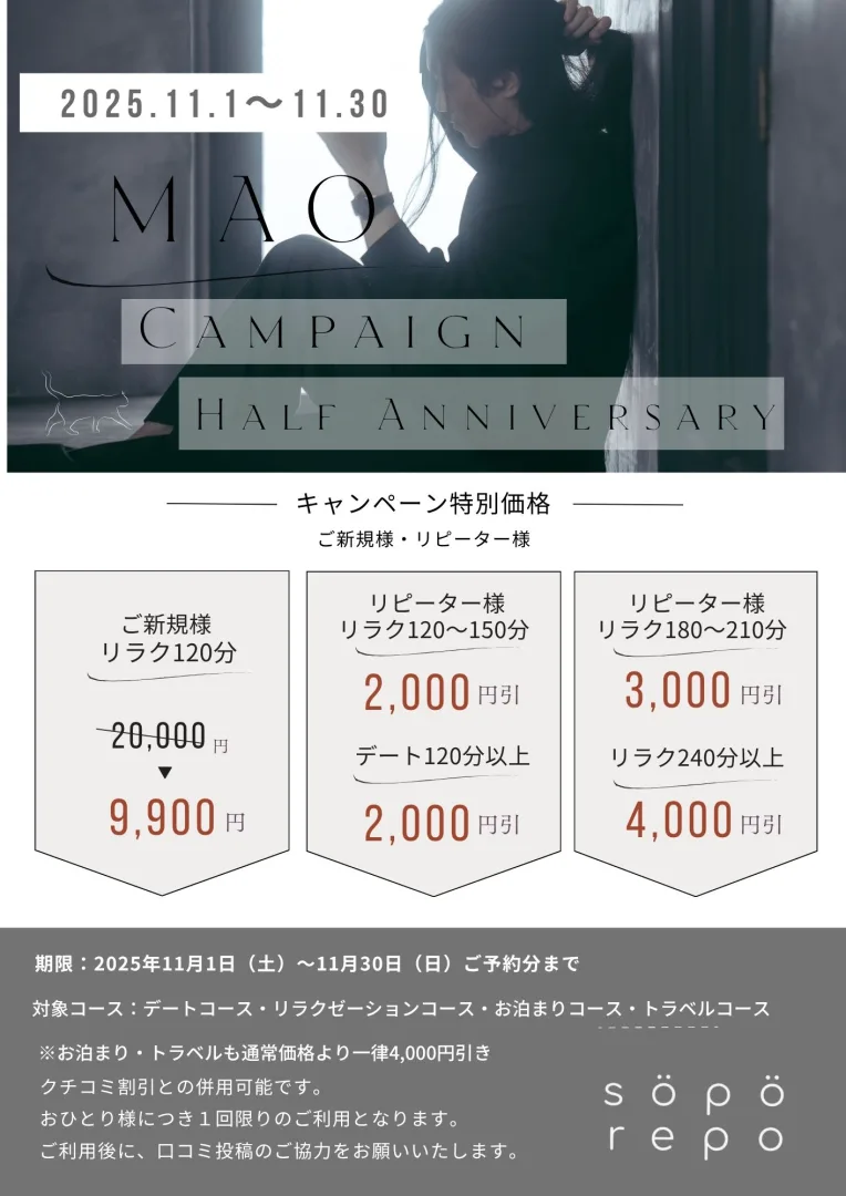・対象期間中に既にご予約済みのお客様も割引の対象となります。該当される方へは、マオより直接ご案内いたします。