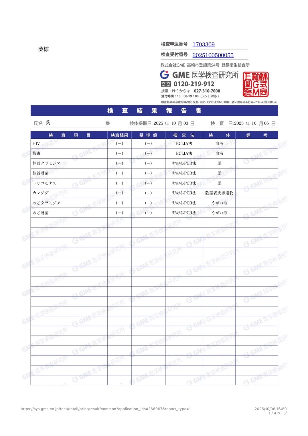 『検査結果 葵』 スタッフ名:葵 検体採取日:2025年10月3日 検査日:2025年10月6日 söpö repoではお客様に安心してご利用いただくため、月に一度の性病検査を全てのスタッフに義務付けております。施術の際に検査結果をお見せすることも可能です。お気軽にお申し付けください。