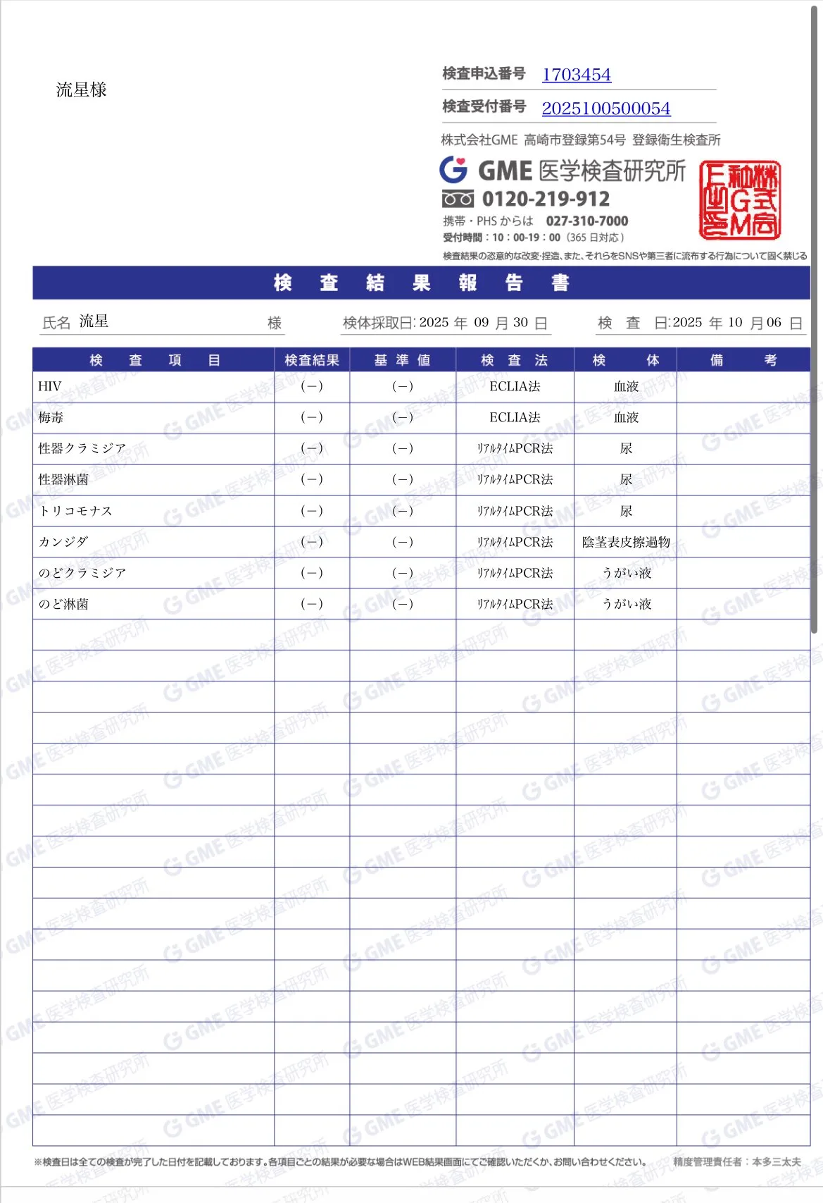『検査結果 流星』 スタッフ名:流星 検体採取日:2025年9月30日 検査日:2025年10月6日 söpö repoではお客様に安心してご利用いただくため、月に一度の性病検査を全てのスタッフに義務付けております。施術の際に検査結果をお見せすることも可能です。お気軽にお申し付けください。