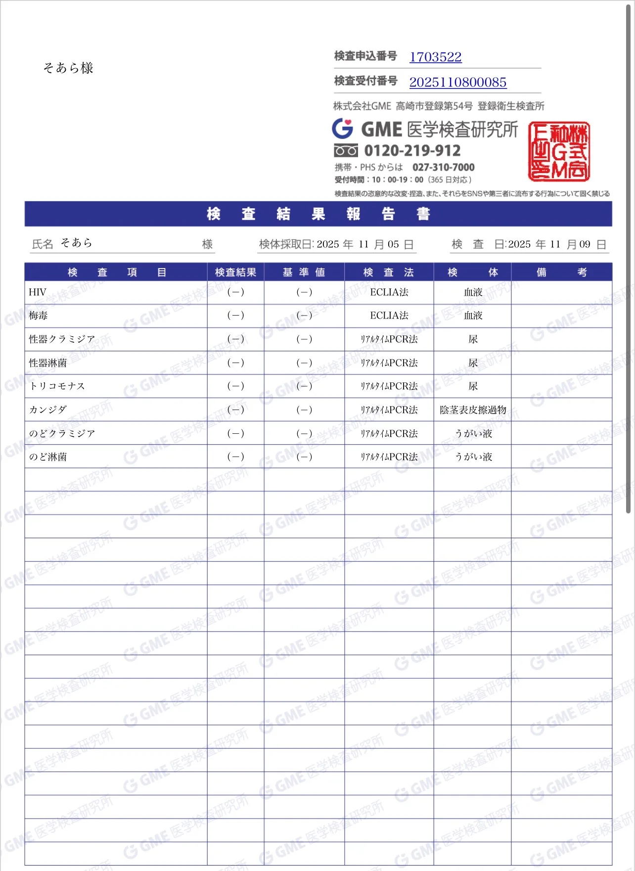 『検査結果 そあら』 スタッフ名:そあら 検体採取日:2025年11月5日 検査日:2025年11月9日 söpö repoではお客様に安心してご利用いただくため、月に一度の性病検査を全てのスタッフに義務付けております。施術の際に検査結果をお見せすることも可能です。お気軽にお申し付けください。